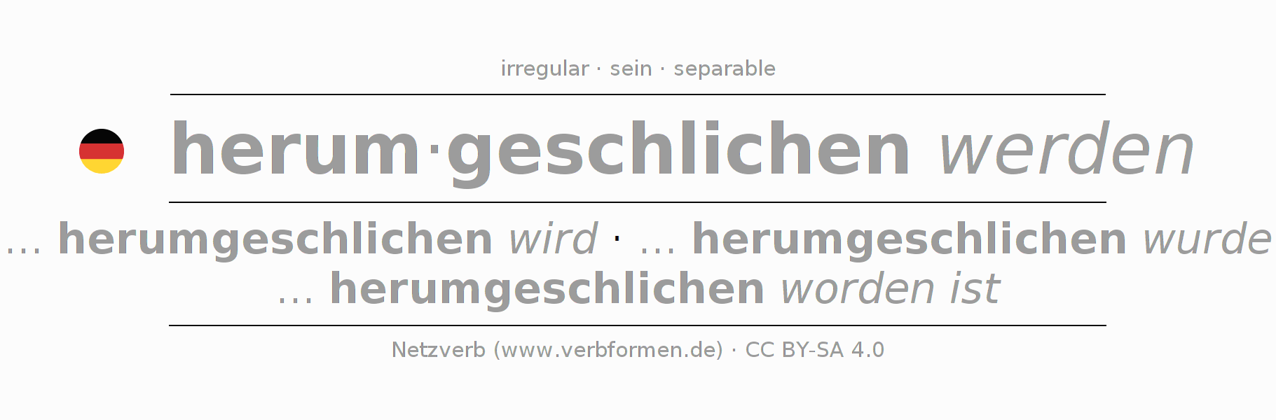 El verbo herumschleichen, conjugado completamente en todas las personas y números gramaticales en Infinitivo Presente Pasado perfecto.