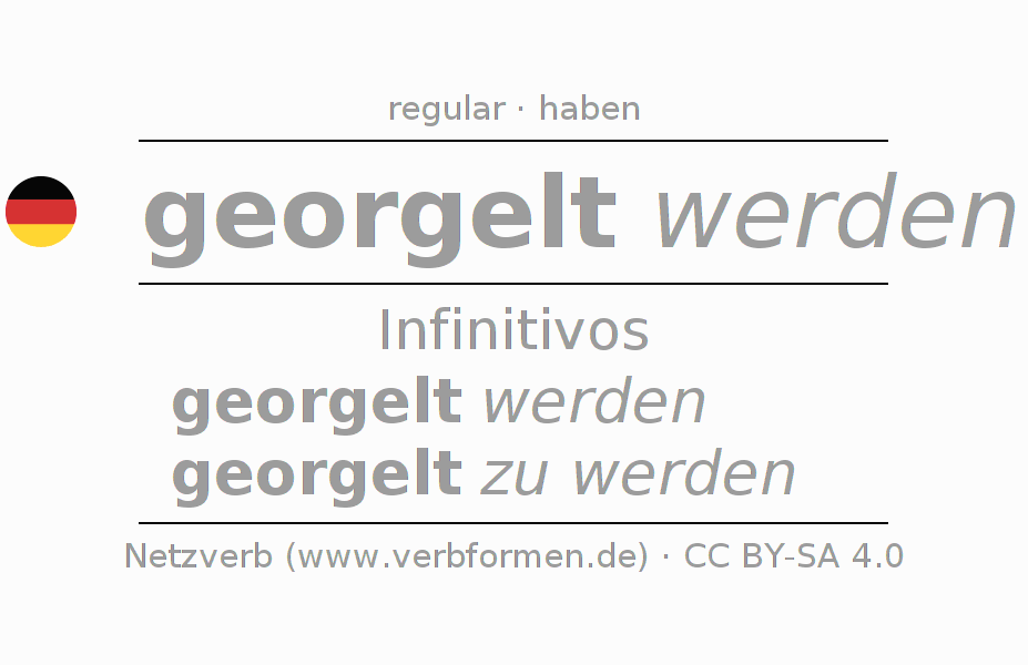 La conjugación de orgeln en Infinitivo Presente Pasado perfecto forma básica Pasivo procesivo es georgelt werden, georgelt zu werden.Para construir esta formas se requiere seguir algunas reglas gramaticales y también las especificaciones para la conjugación de verbos simples de orgeln en Infinitivo . Comentarios ☆