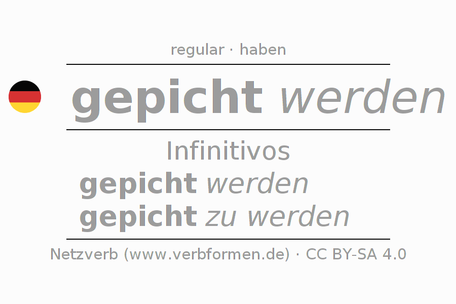 La conjugación de pichen en Infinitivo Presente Pasado perfecto forma básica Pasivo procesivo es gepicht werden, gepicht zu werden.Para construir esta formas se requiere seguir algunas reglas gramaticales y también las especificaciones para la conjugación de verbos simples de pichen en Infinitivo . Comentarios ☆