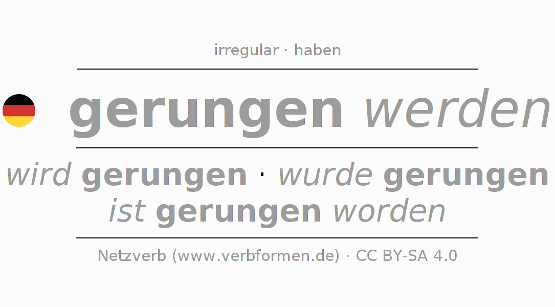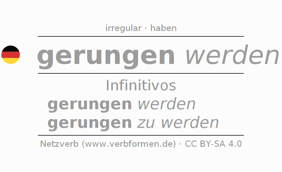 La conjugación de ringen en Infinitivo Presente Pasado perfecto forma básica Pasivo procesivo es gerungen werden, gerungen zu werden.Para construir esta formas se requiere seguir algunas reglas gramaticales y también las especificaciones para la conjugación de verbos simples de ringen en Infinitivo . Comentarios ☆