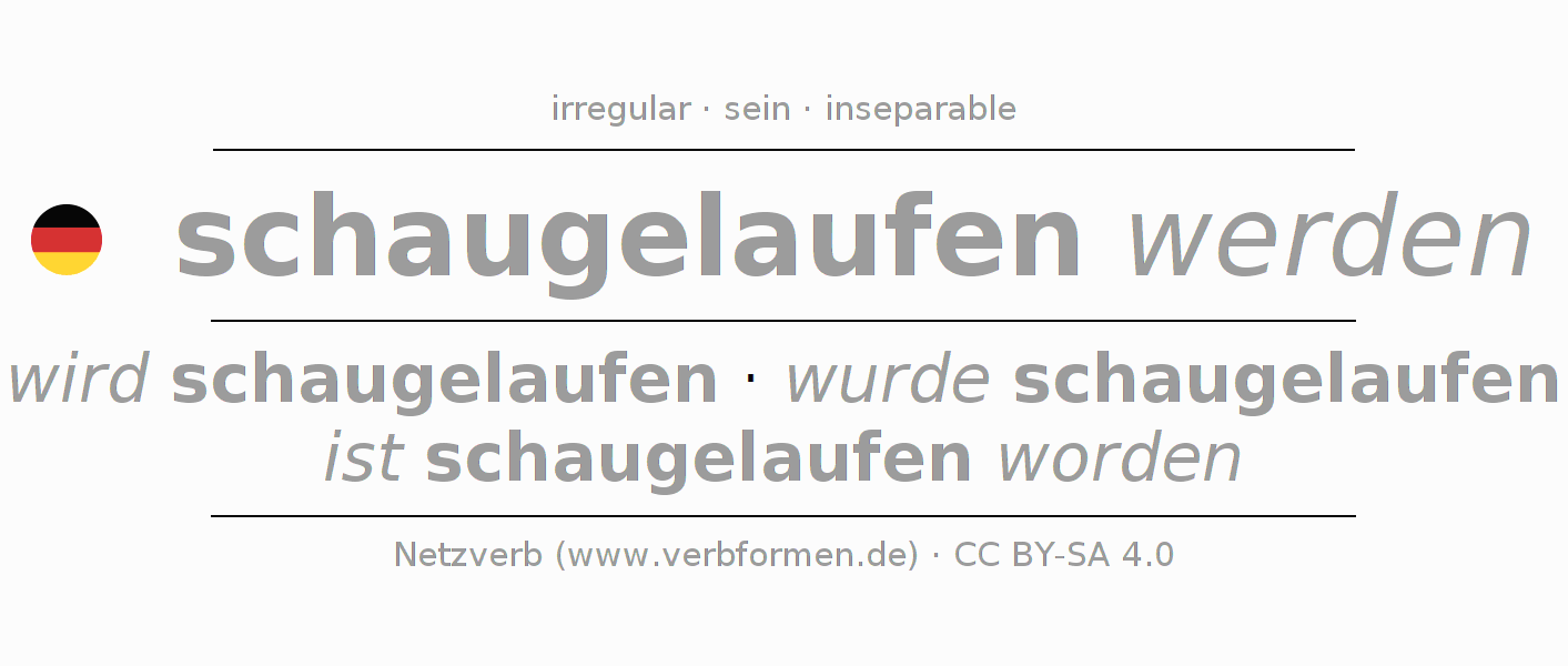 El verbo schaulaufen, conjugado completamente en todas las personas y números gramaticales en Infinitivo Presente Pasado perfecto.