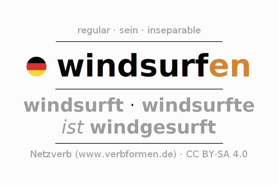 El verbo windsurfen, conjugado completamente en todas las personas y números gramaticales en Infinitivo Presente Pasado perfecto.