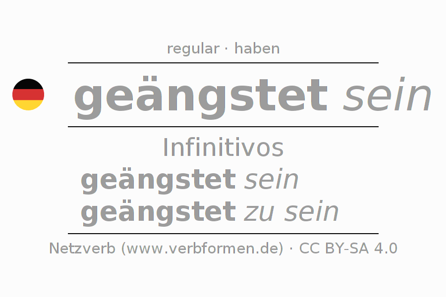 La conjugación de ängsten en Infinitivo Presente Pasado perfecto forma básica Pasivo situativo es geängstet sein, geängstet zu sein.Para construir esta formas se requiere seguir algunas reglas gramaticales y también las especificaciones para la conjugación de verbos simples de ängsten en Infinitivo . Comentarios ☆