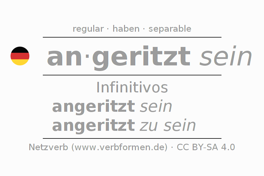 La conjugación de anritzen en Infinitivo Presente Pasado perfecto forma básica Pasivo situativo es angeritzt sein, angeritzt zu sein.Para construir esta formas se requiere seguir algunas reglas gramaticales y también las especificaciones para la conjugación de verbos simples de anritzen en Infinitivo . Comentarios ☆
