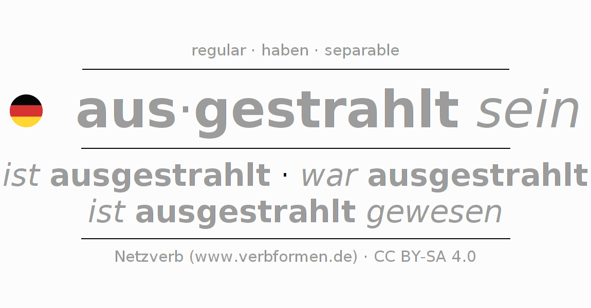 El verbo ausstrahlen, conjugado completamente en todas las personas y números gramaticales en Infinitivo Presente Pasado perfecto.
