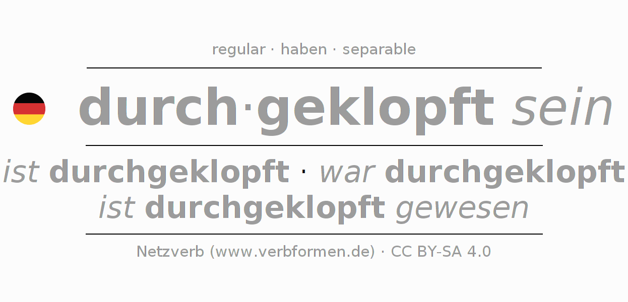 El verbo durchklopfen, conjugado completamente en todas las personas y números gramaticales en Infinitivo Presente Pasado perfecto.