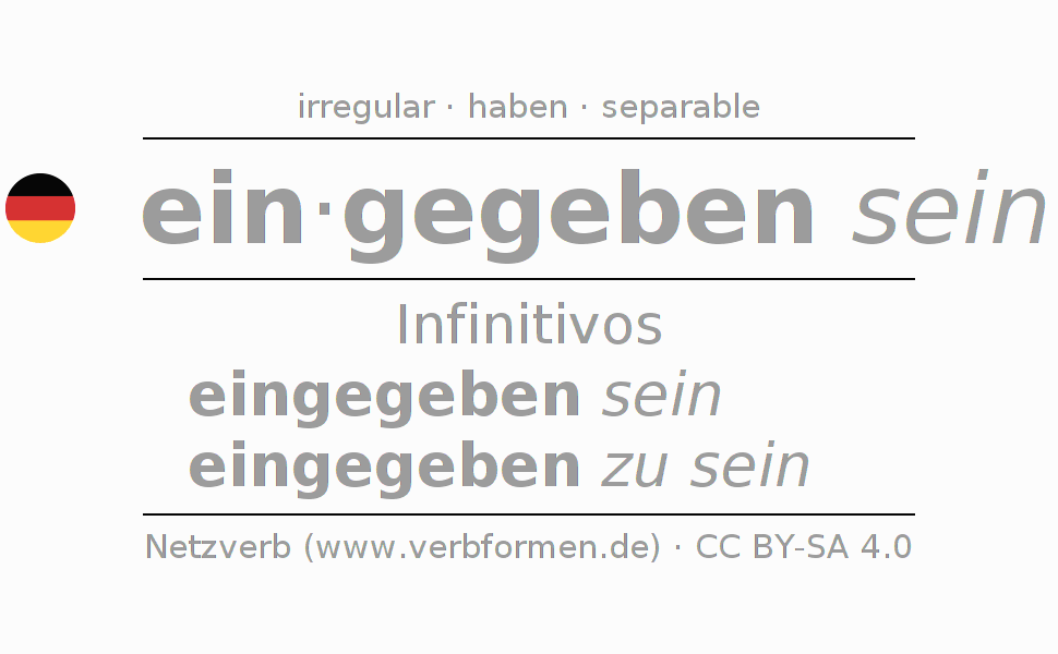 La conjugación de eingeben en Infinitivo Presente Pasado perfecto forma básica Pasivo situativo es eingegeben sein, eingegeben zu sein.Para construir esta formas se requiere seguir algunas reglas gramaticales y también las especificaciones para la conjugación de verbos simples de eingeben en Infinitivo . Comentarios ☆