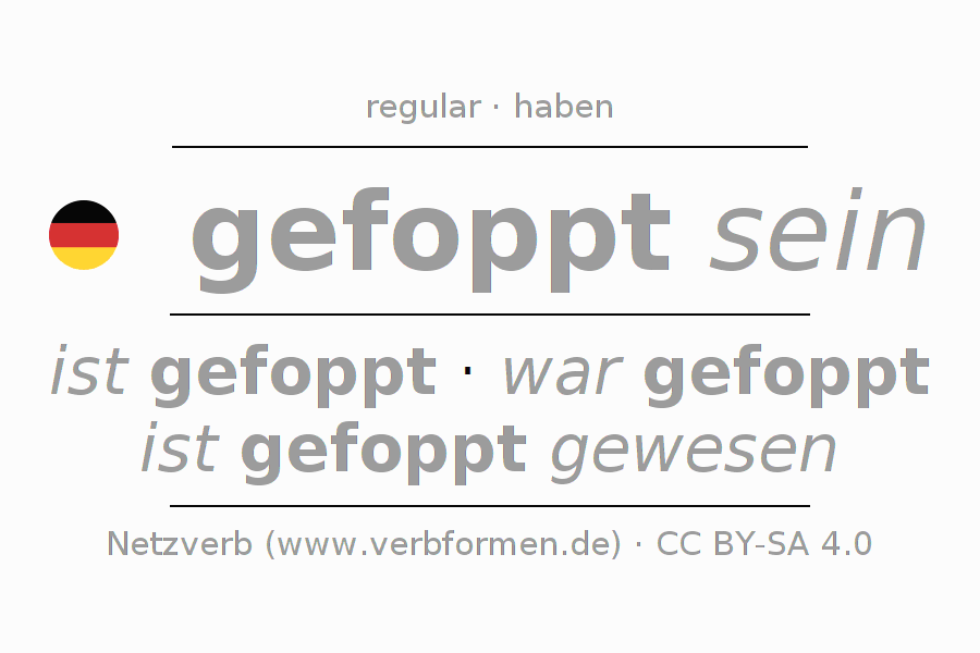 La conjugación de foppen en Infinitivo Presente Pasado perfecto forma básica Pasivo situativo es gefoppt sein, gefoppt zu sein.Para construir esta formas se requiere seguir algunas reglas gramaticales y también las especificaciones para la conjugación de verbos simples de foppen en Infinitivo . Comentarios ☆