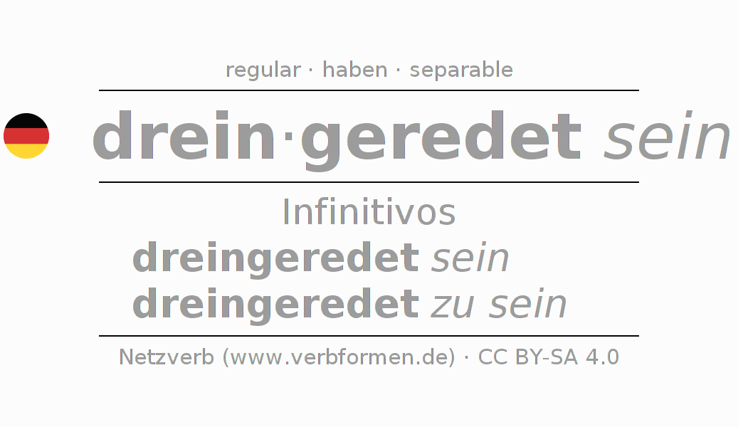 La conjugación de dreinreden en Infinitivo Presente Pasado perfecto forma básica Pasivo situativo es dreingeredet sein, dreingeredet zu sein.Para construir esta formas se requiere seguir algunas reglas gramaticales y también las especificaciones para la conjugación de verbos simples de dreinreden en Infinitivo . Comentarios ☆