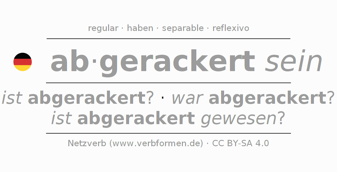 La conjugación de sich abrackern en Infinitivo Presente Pasado perfecto forma básica Pasivo situativo es abgerackert sein, abgerackert zu sein.Para construir esta formas se requiere seguir algunas reglas gramaticales y también las especificaciones para la conjugación de verbos simples de abrackern en Infinitivo . Comentarios ☆