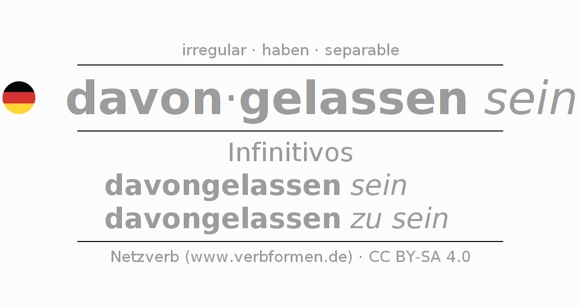La conjugación de davonlassen en Infinitivo Presente Pasado perfecto forma básica Pasivo situativo es davongelassen sein, davongelassen zu sein.Para construir esta formas se requiere seguir algunas reglas gramaticales y también las especificaciones para la conjugación de verbos simples de davonlassen en Infinitivo . Comentarios ☆