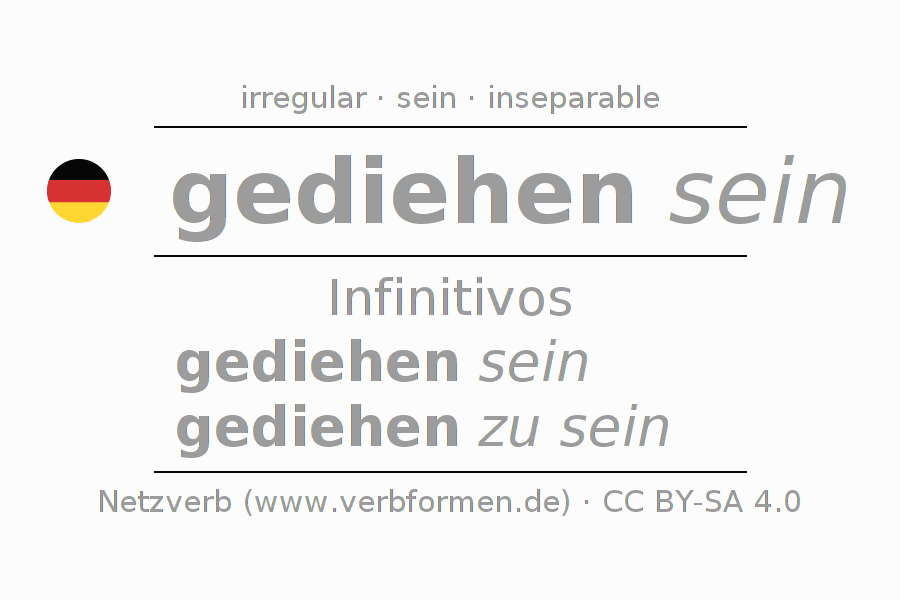 El verbo gedeihen, conjugado completamente en todas las personas y números gramaticales en Infinitivo Presente Pasado perfecto.
