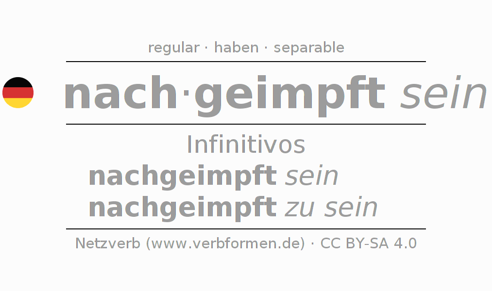 La conjugación de nachimpfen en Infinitivo Presente Pasado perfecto forma básica Pasivo situativo es nachgeimpft sein, nachgeimpft zu sein.Para construir esta formas se requiere seguir algunas reglas gramaticales y también las especificaciones para la conjugación de verbos simples de nachimpfen en Infinitivo . Comentarios ☆