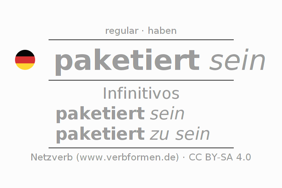 El verbo paketieren, conjugado completamente en todas las personas y números gramaticales en Infinitivo Presente Pasado perfecto.
