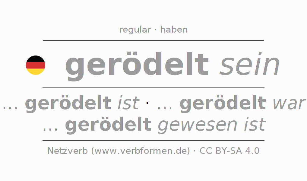 El verbo rödeln, conjugado completamente en todas las personas y números gramaticales en Infinitivo Presente Pasado perfecto.
