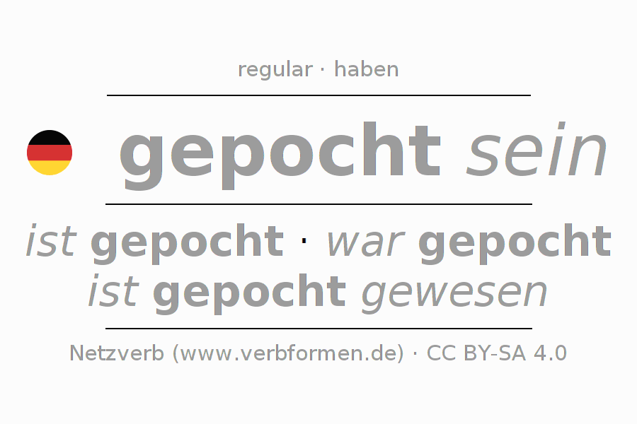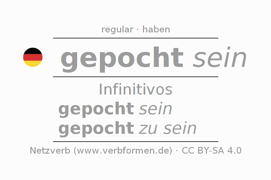 La conjugación de pochen en Infinitivo Presente Pasado perfecto forma básica Pasivo situativo es gepocht sein, gepocht zu sein.Para construir esta formas se requiere seguir algunas reglas gramaticales y también las especificaciones para la conjugación de verbos simples de pochen en Infinitivo . Comentarios ☆
