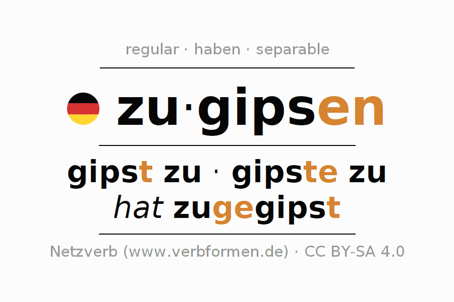 El verbo zugipsen, conjugado completamente en todas las personas y números gramaticales en Infinitivo Presente Pasado perfecto.