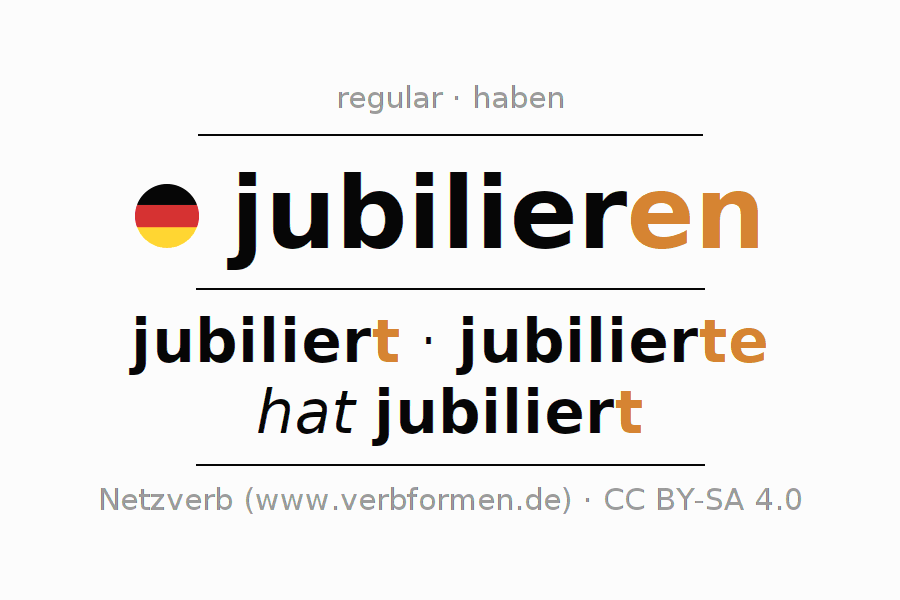 Tablas de verbos para la conjugación de jubilieren en línea, representadas de forma simple, con todas las construcciones verbales en singular y plural, en todas las personas gramaticales (1ª persona, 2ª persona, 3ª persona). El practicar la conjugación del verbo jubilieren es útil para tareas, exámenes, la escuela, la universidad, las clases de alemán y para los estudiantes adultos. Especialmente para los estudiantes del alemán es muy importante el conjugar los verbos y el formar las raíces verbales de forma correcta. Aquí encuentras más información acerca del tema Wiktionary jubilieren und unter jubilieren im Duden.