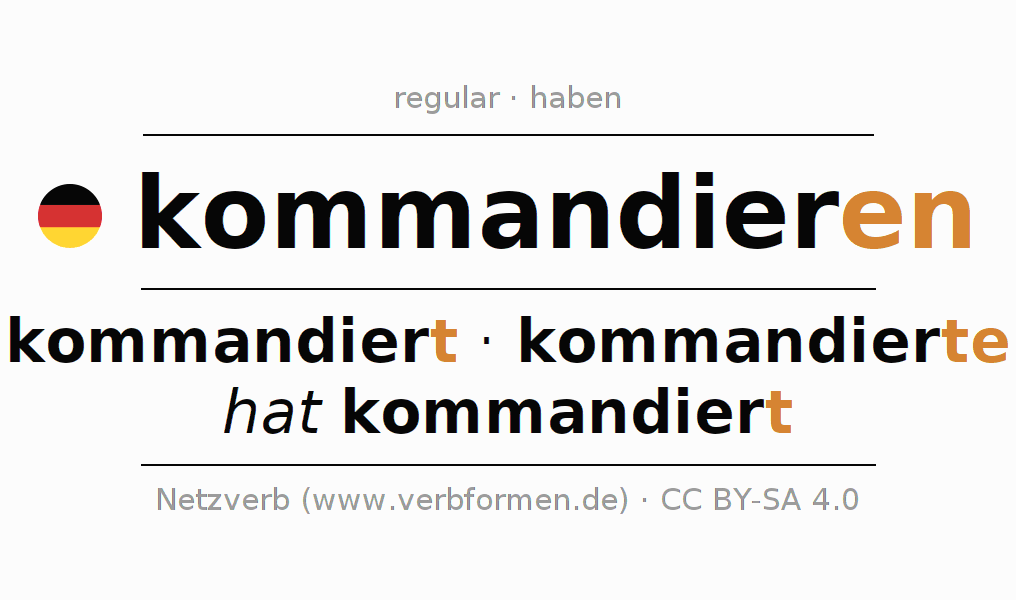- Pasado perfecto: ich habe kommandiert, du hast kommandiert, er hat kommandiert, wir haben kommandiert, ihr habt kommandiert, sie haben kommandiert
