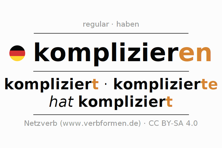 Tablas de verbos para la conjugación de komplizieren en línea, representadas de forma simple, con todas las construcciones verbales en singular y plural, en todas las personas gramaticales (1ª persona, 2ª persona, 3ª persona). El practicar la conjugación del verbo komplizieren es útil para tareas, exámenes, la escuela, la universidad, las clases de alemán y para los estudiantes adultos. Especialmente para los estudiantes del alemán es muy importante el conjugar los verbos y el formar las raíces verbales de forma correcta. Aquí encuentras más información acerca del tema Wiktionary komplizieren und unter komplizieren im Duden.