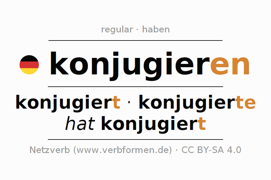 Tablas de verbos para la conjugación de konjugieren en línea, representadas de forma simple, con todas las construcciones verbales en singular y plural, en todas las personas gramaticales (1ª persona, 2ª persona, 3ª persona). El practicar la conjugación del verbo konjugieren es útil para tareas, exámenes, la escuela, la universidad, las clases de alemán y para los estudiantes adultos. Especialmente para los estudiantes del alemán es muy importante el conjugar los verbos y el formar las raíces verbales de forma correcta. Aquí encuentras más información acerca del tema Wiktionary konjugieren und unter konjugieren im Duden.