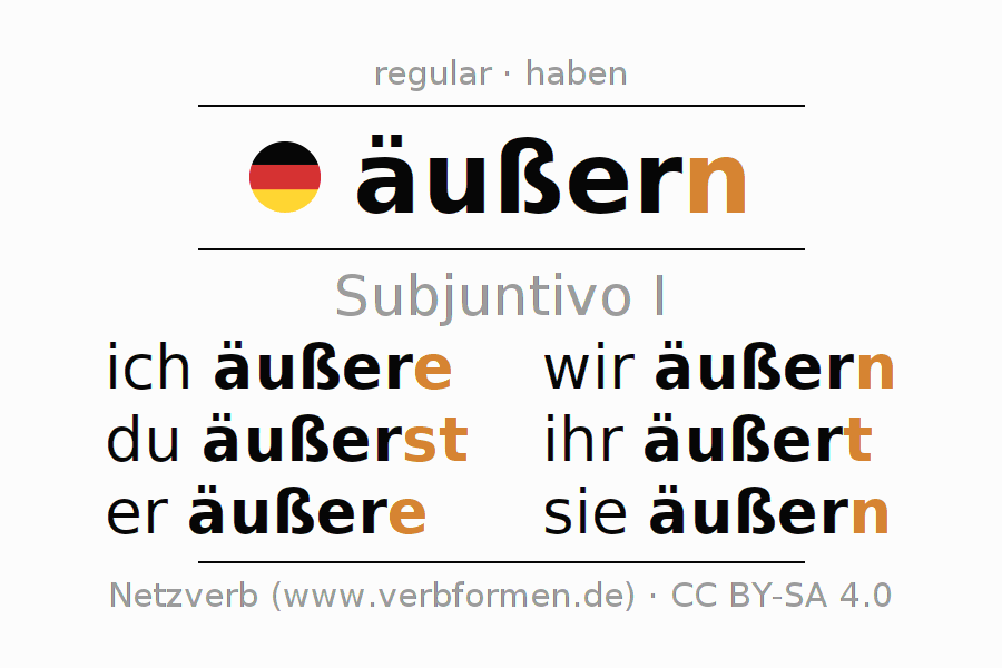Este verbo äußern (expresar, manifestarse) se conjuga en subjuntivo I de la siguiente manera: ich äuß(e)re, du äußerst, er äuß(e)re, wir äußern, ihr äußert, sie äußern