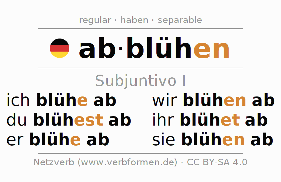 El verbo abblühen, conjugado completamente en todas las personas y números gramaticales en Subjuntivo Presente.