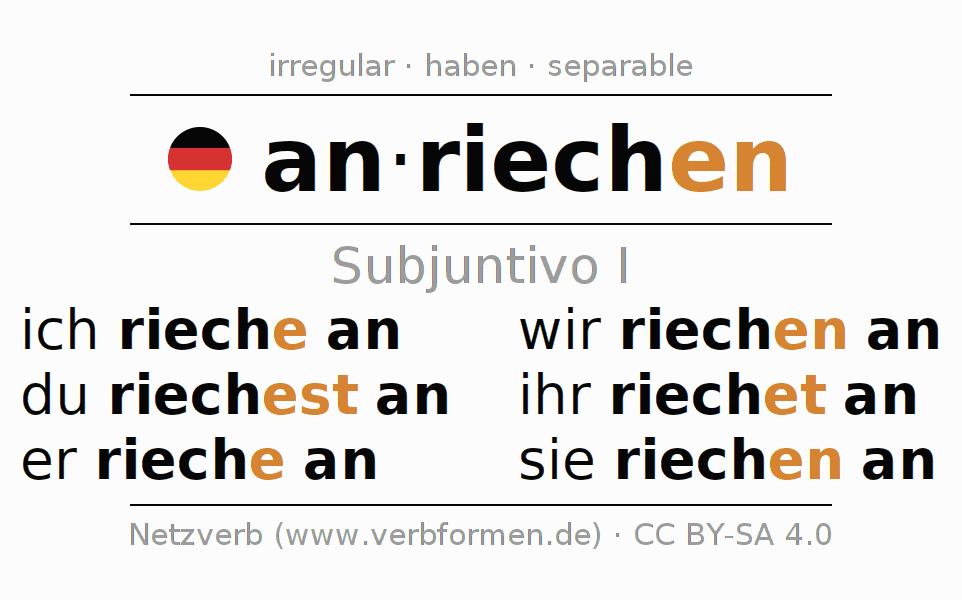 Este verbo anriechen (oler, reconocer) se conjuga en subjuntivo I de la siguiente manera: ich rieche an, du riechest an, er rieche an, wir riechen an, ihr riechet an, sie riechen an