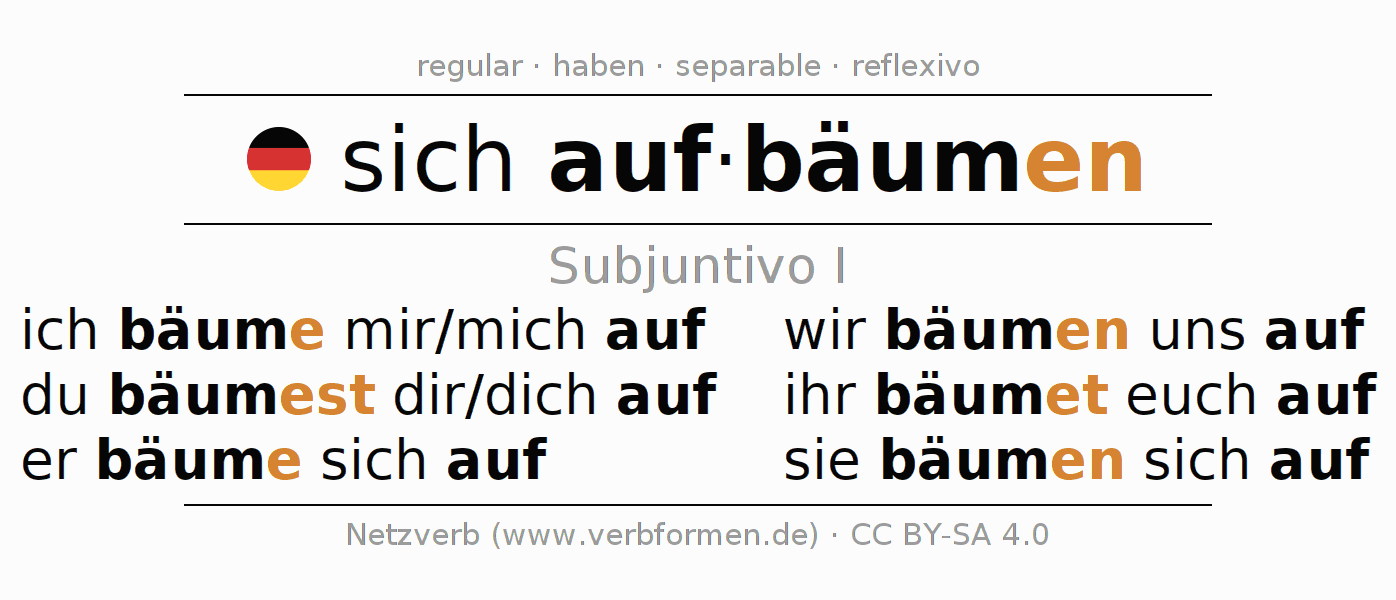 Este verbo sich aufbäumen (rebelarse, abalanzarse) se conjuga en subjuntivo I de la siguiente manera: ich bäume mir/mich auf, du bäumest dir/dich auf, er bäume sich auf, wir bäumen uns auf, ihr bäumet euch auf, sie bäumen sich auf