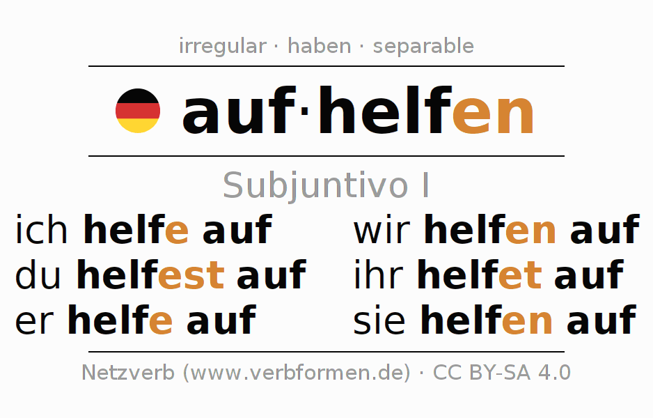Este verbo aufhelfen (ayudar, mejorar) se conjuga en subjuntivo I de la siguiente manera: ich helfe auf, du helfest auf, er helfe auf, wir helfen auf, ihr helfet auf, sie helfen auf