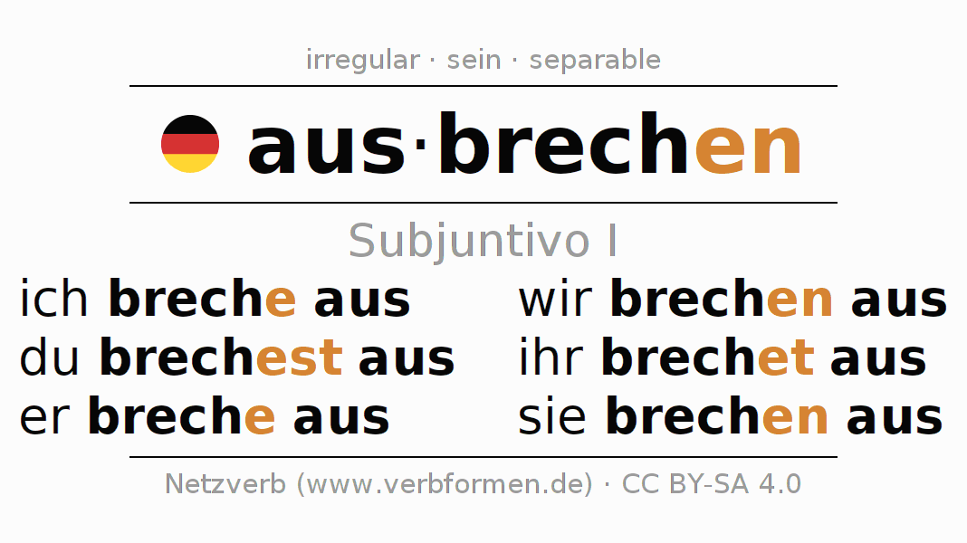 El verbo ausbrechen, conjugado completamente en todas las personas y números gramaticales en Subjuntivo Presente.