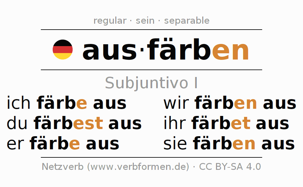 El verbo ausfärben, conjugado completamente en todas las personas y números gramaticales en Subjuntivo Presente.