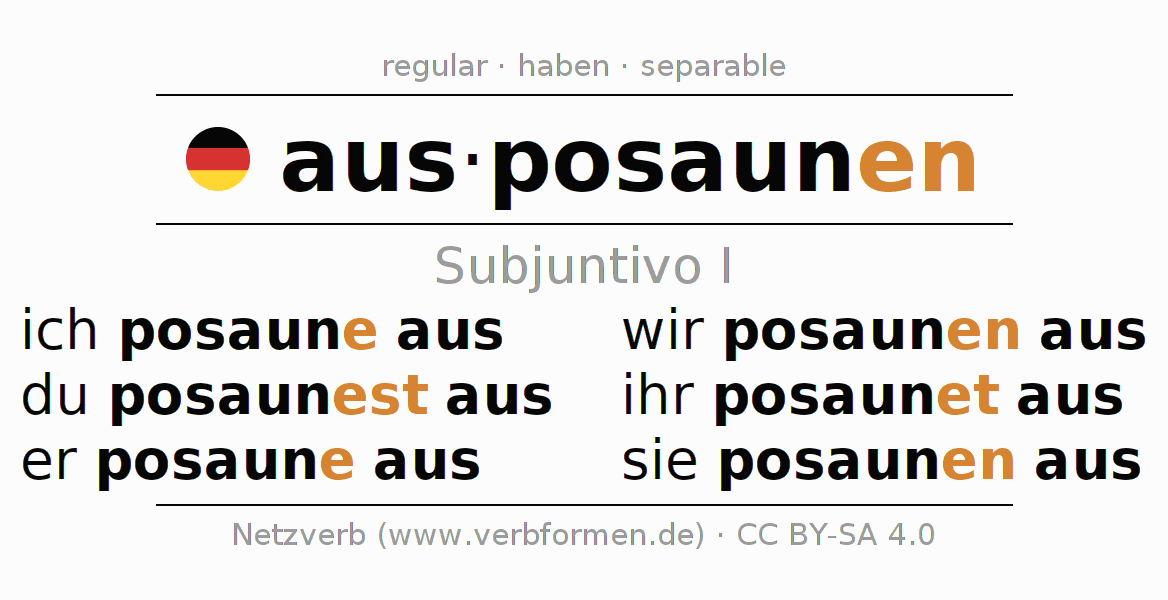 Este verbo ausposaunen (divulgar, pregonar) se conjuga en subjuntivo I de la siguiente manera: ich posaune aus, du posaunest aus, er posaune aus, wir posaunen aus, ihr posaunet aus, sie posaunen aus