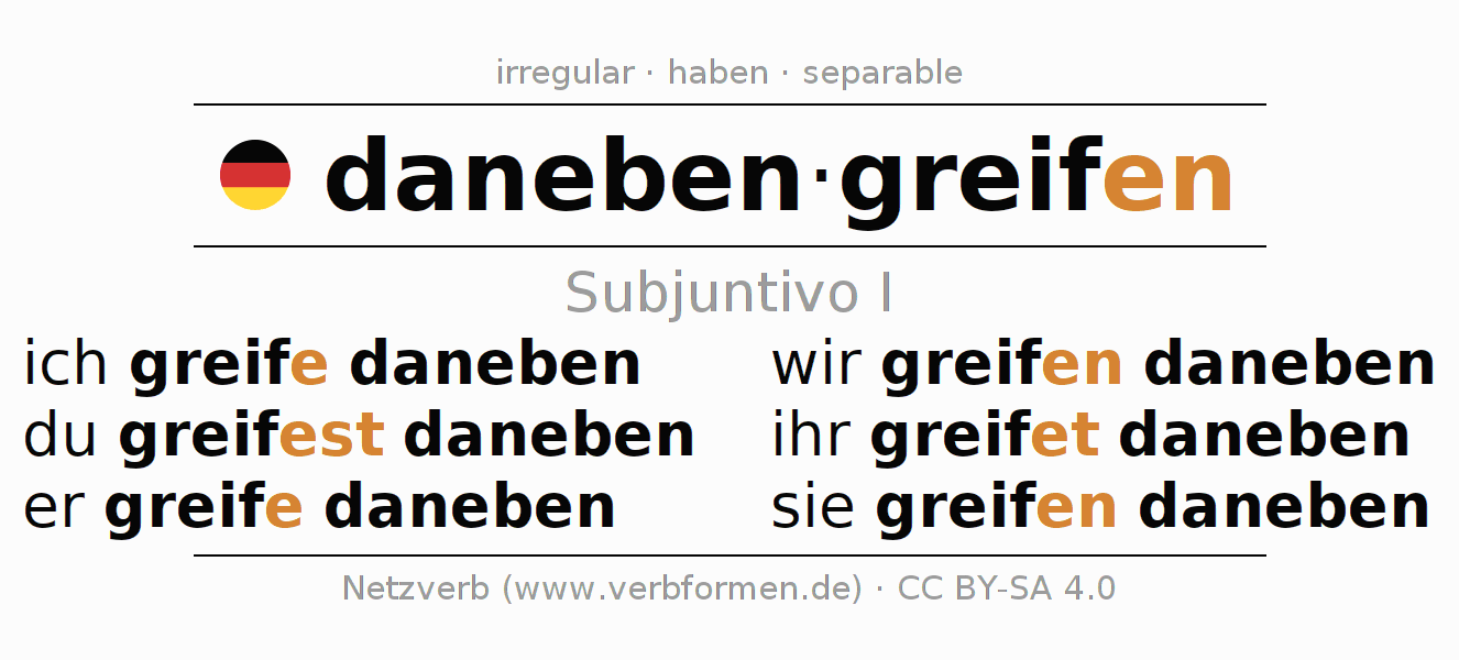 Este verbo danebengreifen (equivocarse, errar) se conjuga en subjuntivo I de la siguiente manera: ich greife daneben, du greifest daneben, er greife daneben, wir greifen daneben, ihr greifet daneben, sie greifen daneben