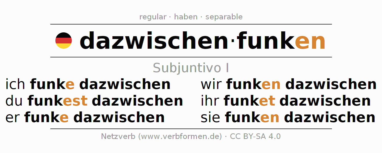 El verbo dazwischenfunken, conjugado completamente en todas las personas y números gramaticales en Subjuntivo Presente.