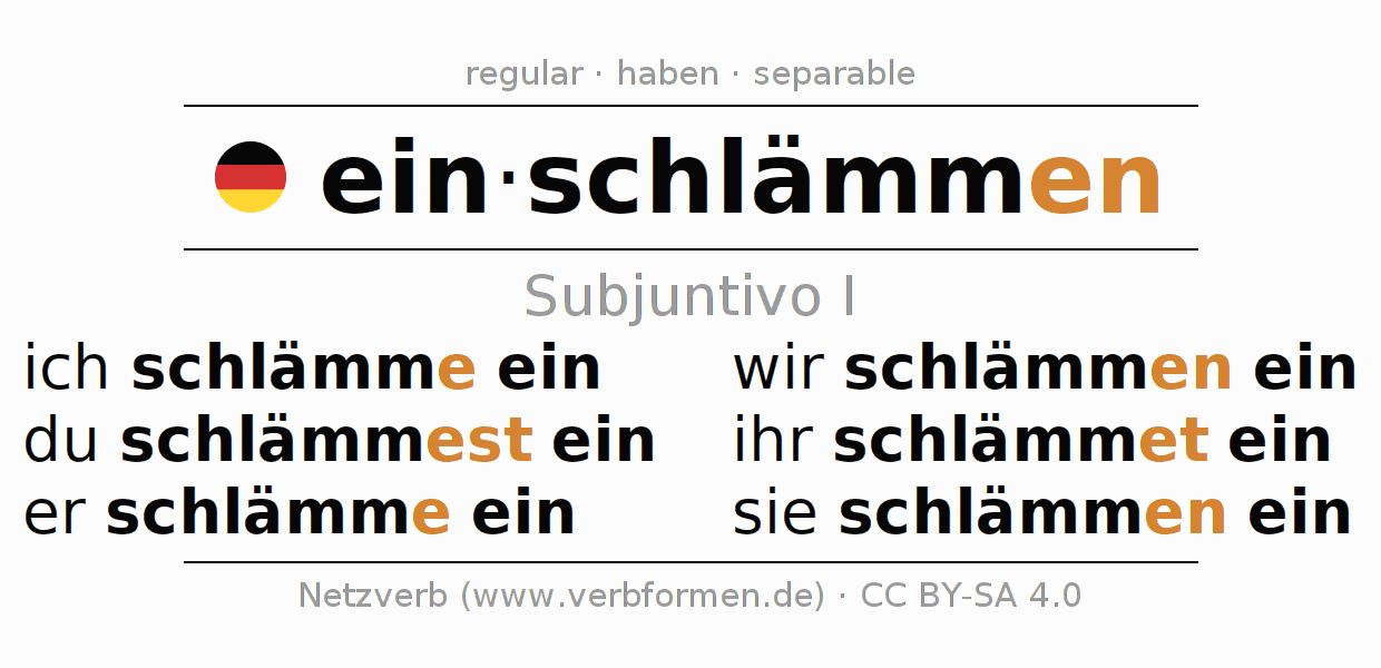 Este verbo einschlämmen (regar) se conjuga en subjuntivo I de la siguiente manera: ich schlämme ein, du schlämmest ein, er schlämme ein, wir schlämmen ein, ihr schlämmet ein, sie schlämmen ein