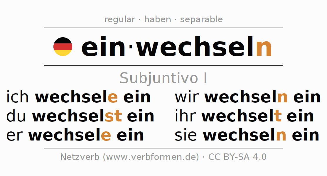 El verbo einwechseln, conjugado completamente en todas las personas y números gramaticales en Subjuntivo Presente.