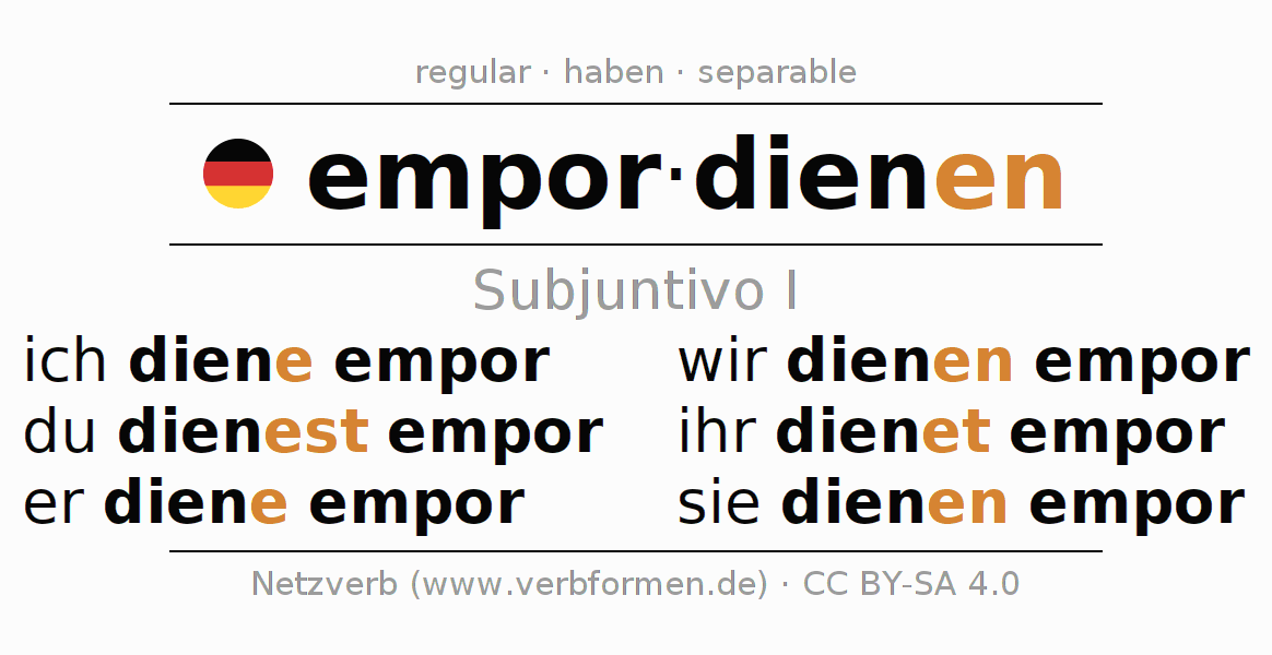 Este verbo empordienen (ascender, promoverse) se conjuga en subjuntivo I de la siguiente manera: ich diene empor, du dienest empor, er diene empor, wir dienen empor, ihr dienet empor, sie dienen empor