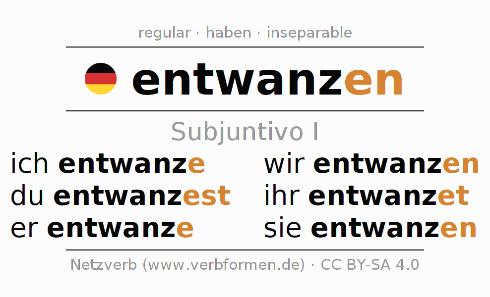 El verbo entwanzen, conjugado completamente en todas las personas y números gramaticales en Subjuntivo Presente.