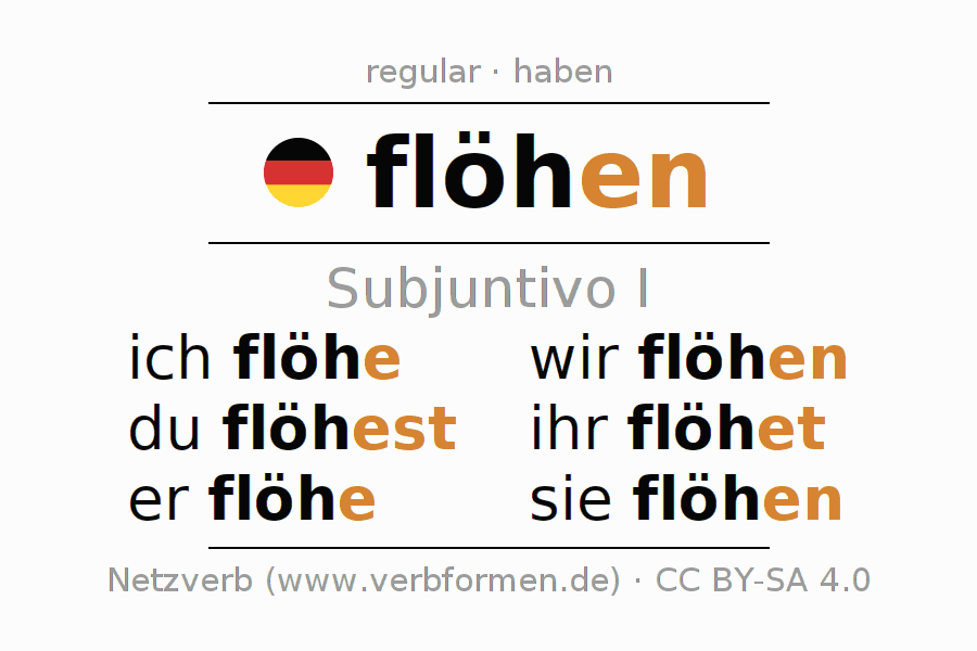 Este verbo flöhen (espulgar, desinfectar) se conjuga en subjuntivo I de la siguiente manera: ich flöhe, du flöhest, er flöhe, wir flöhen, ihr flöhet, sie flöhen