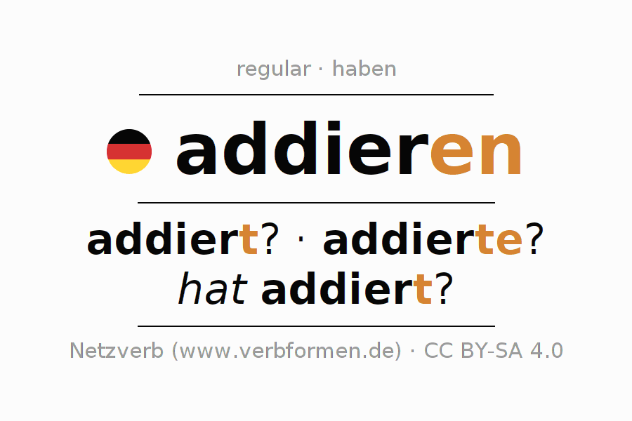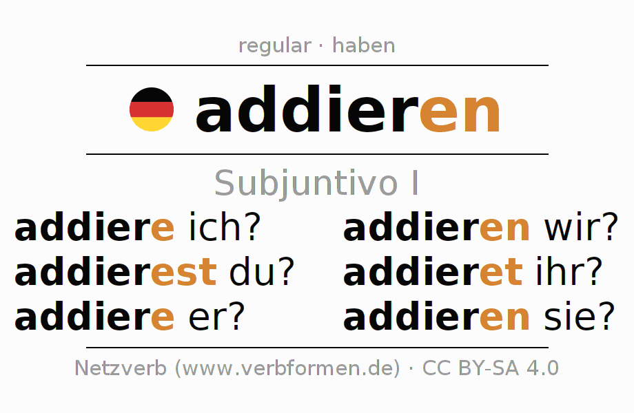 La conjugación de addieren en Subjuntivo Presente Subjuntivo Activo es addiere ich?, addierest du?, addiere er?, addieren wir?, addieret ihr?, addieren sie?.Para construir esta formas se requiere seguir algunas reglas gramaticales y también las especificaciones para la conjugación de verbos simples de addieren en Subjuntivo I . Comentarios ☆