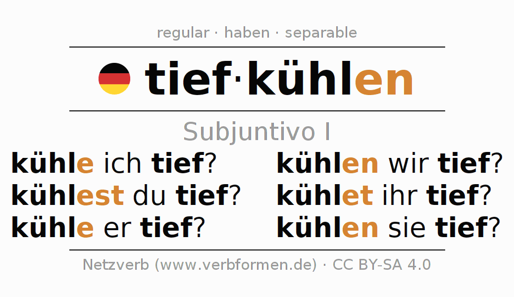 La conjugación de tiefkühlen en Subjuntivo Presente Subjuntivo Activo es kühle ich tief?, kühlest du tief?, kühle er tief?, kühlen wir tief?, kühlet ihr tief?, kühlen sie tief?.Para construir esta formas se requiere seguir algunas reglas gramaticales y también las especificaciones para la conjugación de verbos simples de tiefkühlen en Subjuntivo I . Comentarios ☆