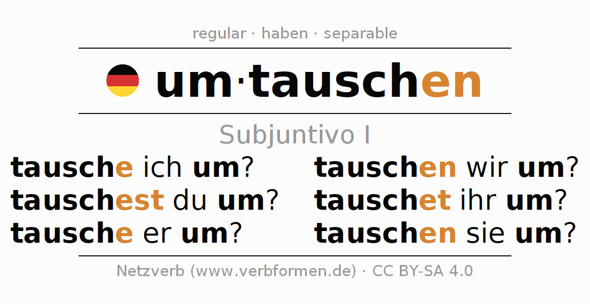 La conjugación de umtauschen en Subjuntivo Presente Subjuntivo Activo es tausche ich um?, tauschest du um?, tausche er um?, tauschen wir um?, tauschet ihr um?, tauschen sie um?.Para construir esta formas se requiere seguir algunas reglas gramaticales y también las especificaciones para la conjugación de verbos simples de umtauschen en Subjuntivo I . Comentarios ☆