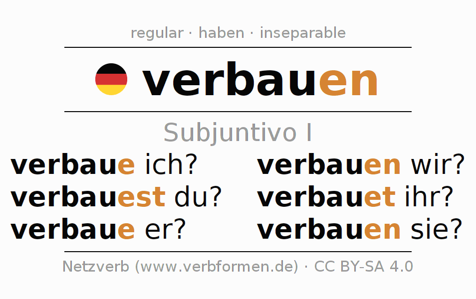 El verbo verbauen, conjugado completamente en todas las personas y números gramaticales en Subjuntivo Presente.