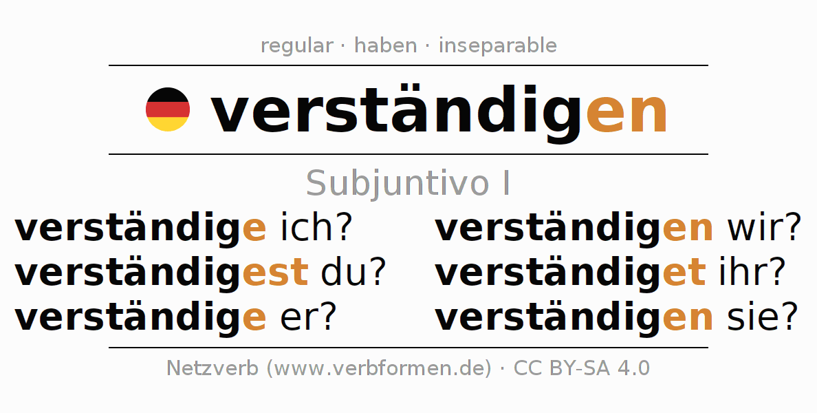 El verbo verständigen, conjugado completamente en todas las personas y números gramaticales en Subjuntivo Presente.