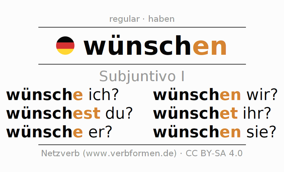 La conjugación de wünschen en Subjuntivo Presente Subjuntivo Activo es wünsche ich?, wünschest du?, wünsche er?, wünschen wir?, wünschet ihr?, wünschen sie?.Para construir esta formas se requiere seguir algunas reglas gramaticales y también las especificaciones para la conjugación de verbos simples de wünschen en Subjuntivo I . Comentarios ☆