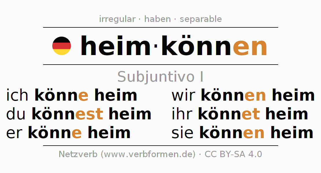 El verbo heimkönnen, conjugado completamente en todas las personas y números gramaticales en Subjuntivo Presente.