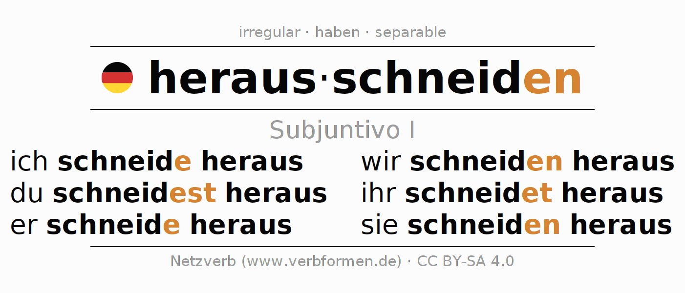 Este verbo herausschneiden (extirpar, recortar) se conjuga en subjuntivo I de la siguiente manera: ich schneide heraus, du schneidest heraus, er schneide heraus, wir schneiden heraus, ihr schneidet heraus, sie schneiden heraus