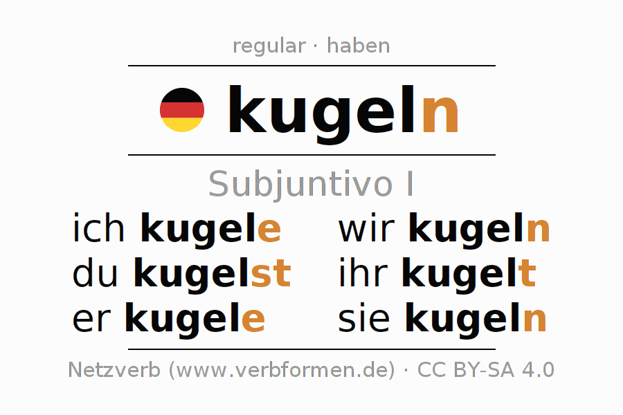 Este verbo kugeln (hacer rodar, rodar) se conjuga en subjuntivo I de la siguiente manera: ich kug(e)le, du kugelst, er kug(e)le, wir kugeln, ihr kugelt, sie kugeln