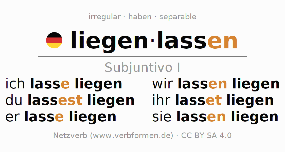 Este verbo liegenlassen (dejar, dejar atrás) se conjuga en subjuntivo I de la siguiente manera: ich lasse liegen, du lassest liegen, er lasse liegen, wir lassen liegen, ihr lasset liegen, sie lassen liegen